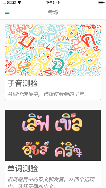 1、包含 泰语子音测验,泰语母音测验,泰语常用句测验。
