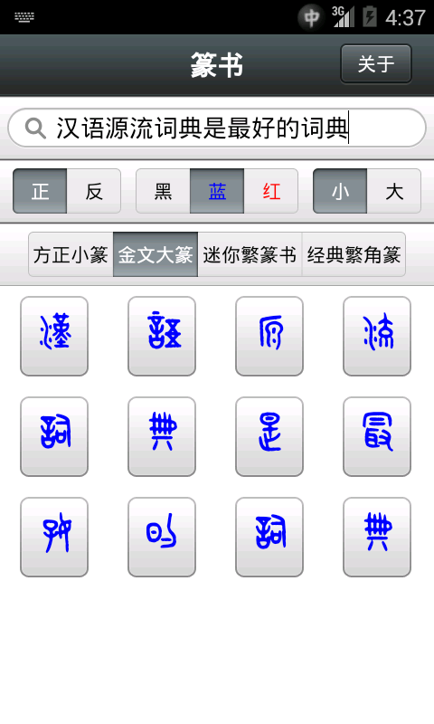 显示汉字的方正小篆、金文大篆、迷你繁篆书、经典繁角篆的写法,支持正写、反写。