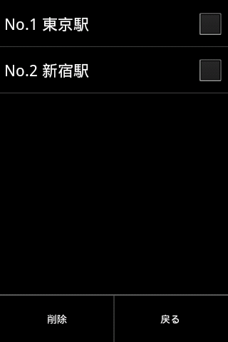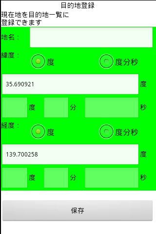 メニューから目的地登録で地名、緯度、経度の入力を行うと現在地から目的地までの方向と距離を表示します。
