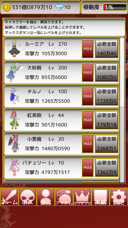 紅魔館を守れ!は、紅魔郷のキャラ+αを育ててボスを倒して紅魔館を守る放置ゲームです。紅魔館の侵略度が上がると不利になってしまうぞ!実績、ランキングにも対応!