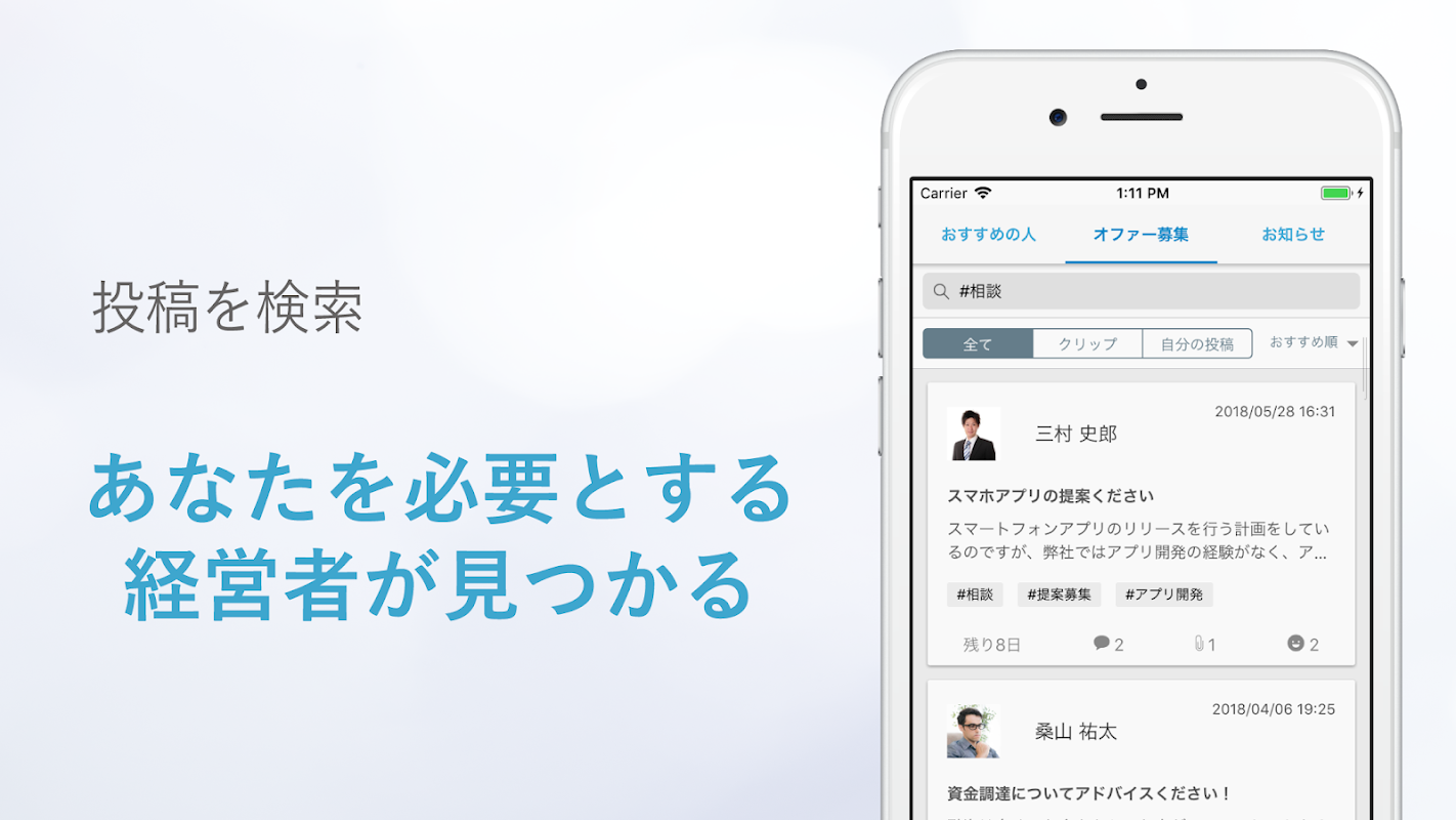 オファー募集機能は、相談を投稿することで、他の経営者からコメントや提案が届きます。あなたはマッチングを選ぶだけ。