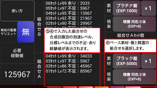 ⑧中央上に、⑥⑦で選択したユニットを何セット準備すると必要な経験値に足りるか表示されます。