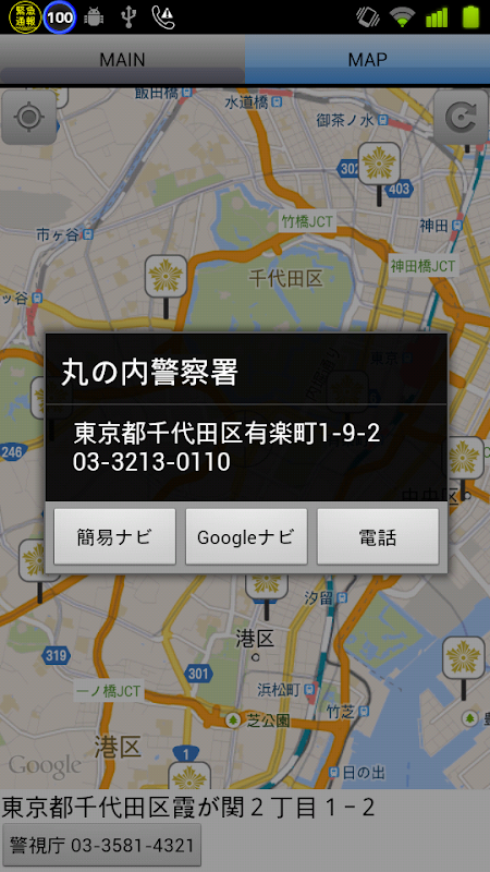 地図で現在地の近くの警察署を表示して電話することが出来ます。