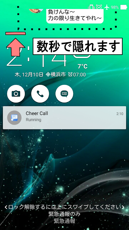 ロック画面を解除するたび、 メールのようにロック解除後に現れて、励ましてくれるアプリです。 顔画像と励ます内容を入力すれば、ランダムで現れあなたを励まします。