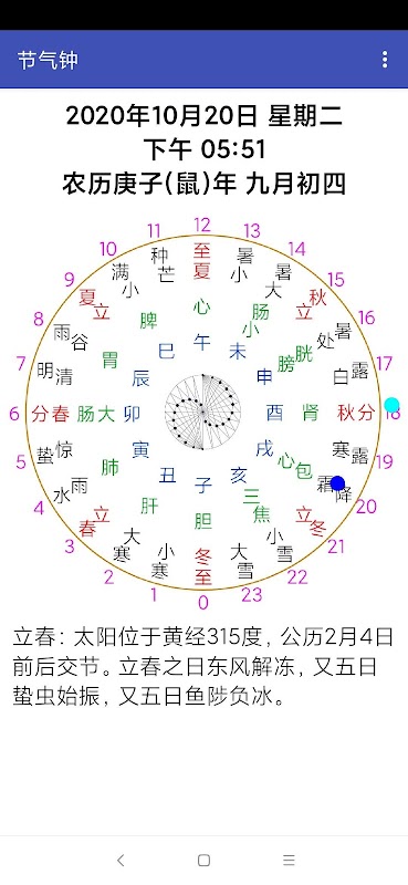 View the lunar calendar date and solar terms information corresponding to the current Gregorian calendar date, and provide knowledge related to solar terms and time.
