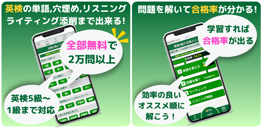 It's all free (no charges), and the Eiken pass rate is more than double! You can practice English vocabulary, fill-in-the-blank, listening, writing, and speaking for Eiken Level 2, Pre-2, Pre-1, Level 1, Level 3, and TOEIC.