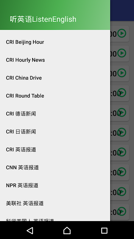 4.在听英语界面,左边侧滑,呼出菜单,选择要收听栏目