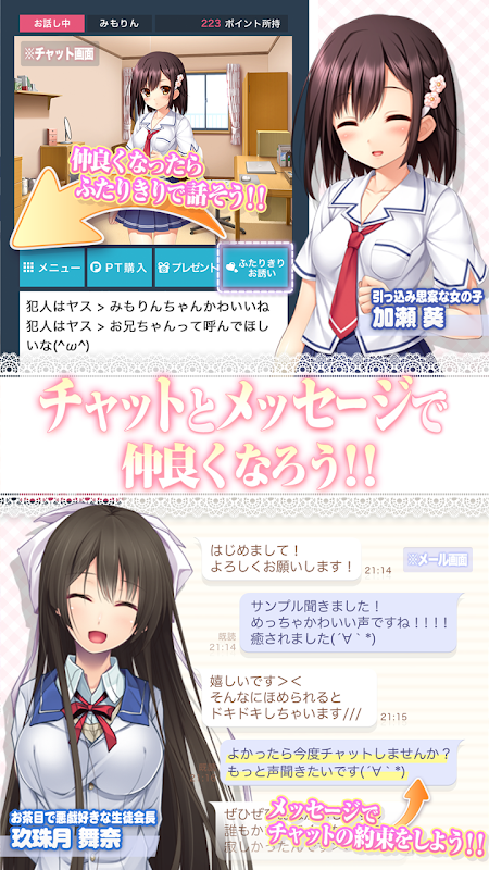 Full voice course in the anime call! Character in real time to match the animation (voice actors) will come over to talk to you. So ['s real voice actor] not even AI also in the game, but please your reply gently ♪