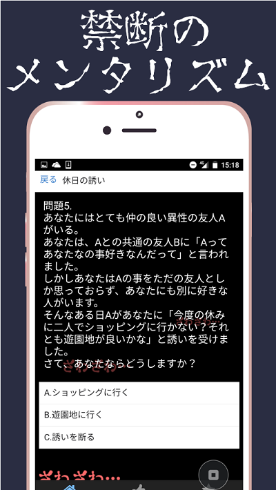 あらゆる人の心理を操るメンタリズムこのアプリは裏ワザ心理テクニックを駆使してあなたの心理を操ろうとします。数々の心理操作術であなたも必ず暗示にかかります。