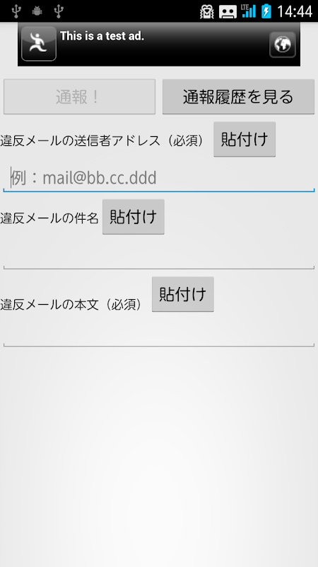 1.ユーザー様がアプリに迷惑メールの内容を入力し、「通報!」ボタンを押します