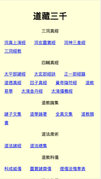 太平部諸經 太玄部經訣 正一部經籙 道德真經 四子真經 黃帝陰符經 道教易學 太清金丹經 太清攝養經