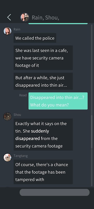 The disappearance of a popular internet show host and influencer Chris became a hot topic on the internet. You, an outsider clueless about the incident, meet Rain, Shou, and Tangtang, who claim to be members of Chris' channel, on a messaging app. They suspect that Chris' disappearance has to do with the urban legend of the "double", as well as the Urban Legend Hunters community. They ask you to join in their search for Chris, and the more you investigate and the more clues you gather, the closer you get to seeing the full picture of what really happened...