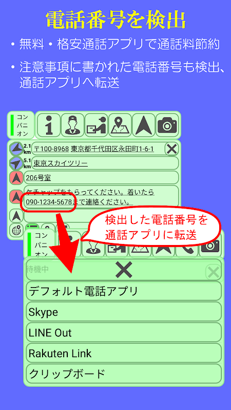 * The phone number of the company or delivery destination → Transfer to the calling app and automatically enter the phone number.