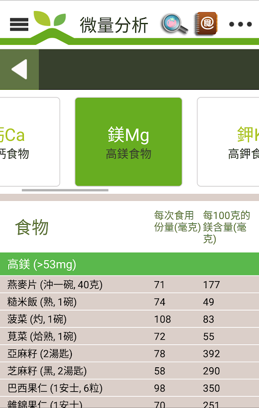 食物分析 讓您了解食品的成分,包括裡面的營養價值等,並分析您的餐單中鉀、鈣、鎂的含量。
