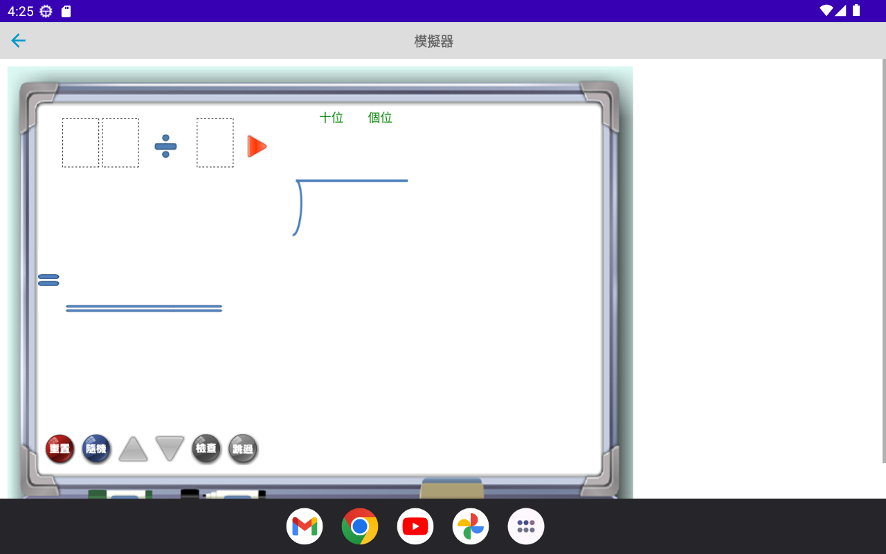 The division simulator is a division calculation application developed by "Mingchuang Education·New Asia Publishing House". By providing different forms of division simulations, it is possible for elementary school students to review various types of division at home.