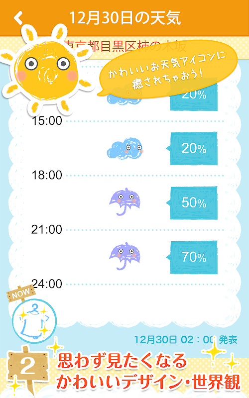 └週間天気予報ページ、時系列天気予報ページにかわいいイラストで表示されます。