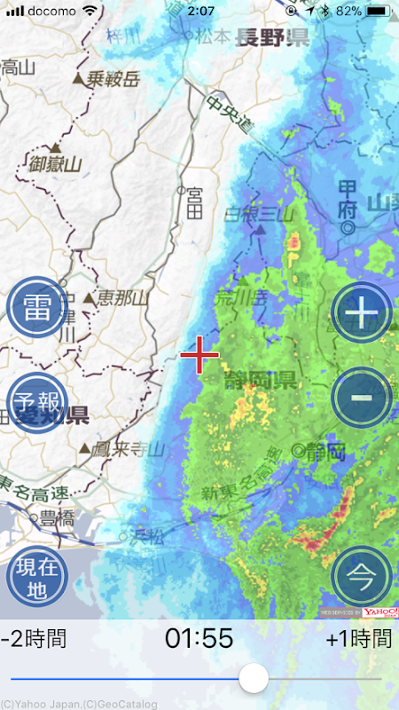 2時間前から1時間後までの雨雲を見られます。大きなボタンと文字、判りやすい機能が特徴です。