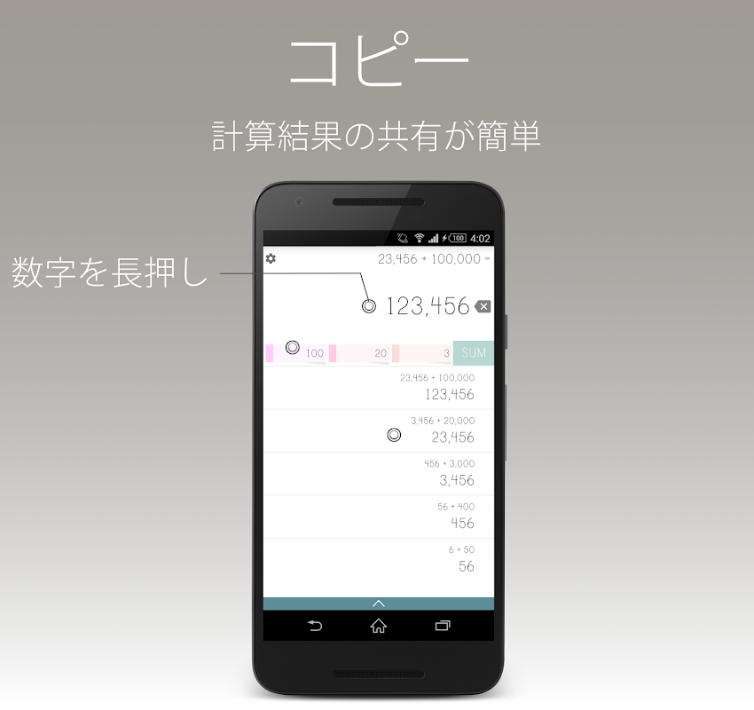 表示されている計算結果・計算履歴・付箋を長押しすることで数値をコピーすることができます.