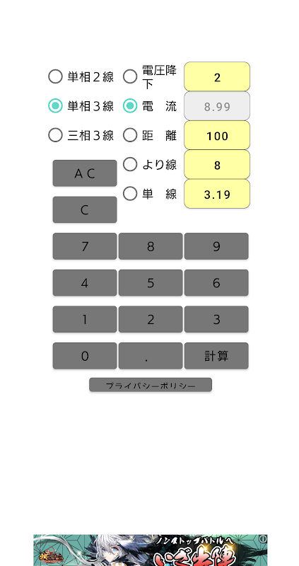 This calculator for calculating the arbitrary value from the voltage drop, current, distance and cable size