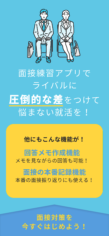 Interview preparation app for new graduate job hunters! This app is ideal for job hunting students who are worried about receiving and answering interviews and who are not good at interviewing.