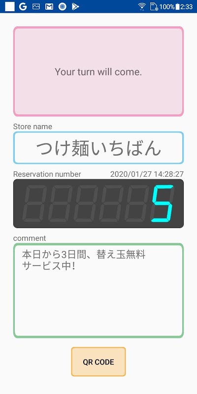 You can easily make a reservation by reading the QR code displayed on the iPad at the shop where the reservation application (順番予約) is installed and pressing the "Register (登録)" button.