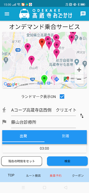 地図上から出発地・目的地を指定しオンデマンド乗合サービスの予約を行うことができます。また、高蔵寺地区のタクシー情報も掲載しております。