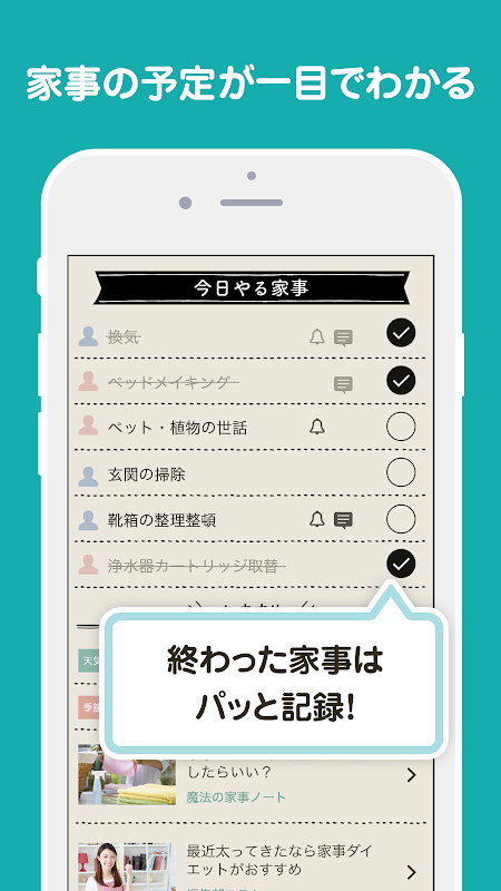 As soon as you open the app, you can see the "housework to do today", so you don't get lost in the housework you should do.