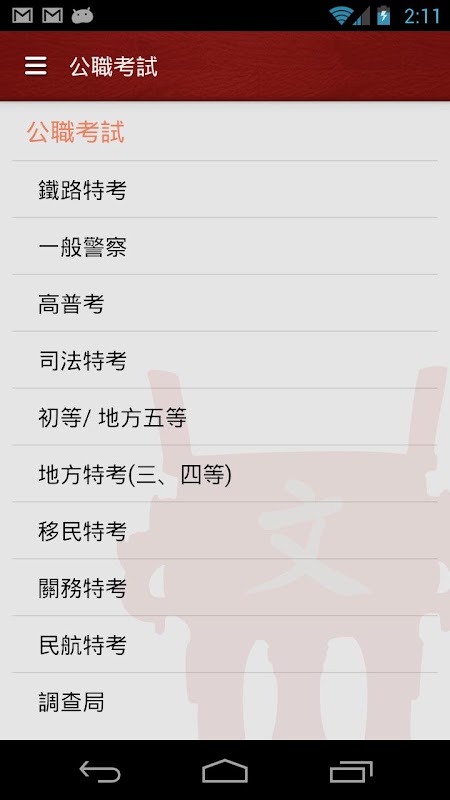* 公職考試 - 鐵路特考,一般警察,高普考,司法特考,初等/ 地方五等,地方特考(三、四等),移民特考,關務特考,民航特考,調查局,海巡特考,稅務特考,身障特考