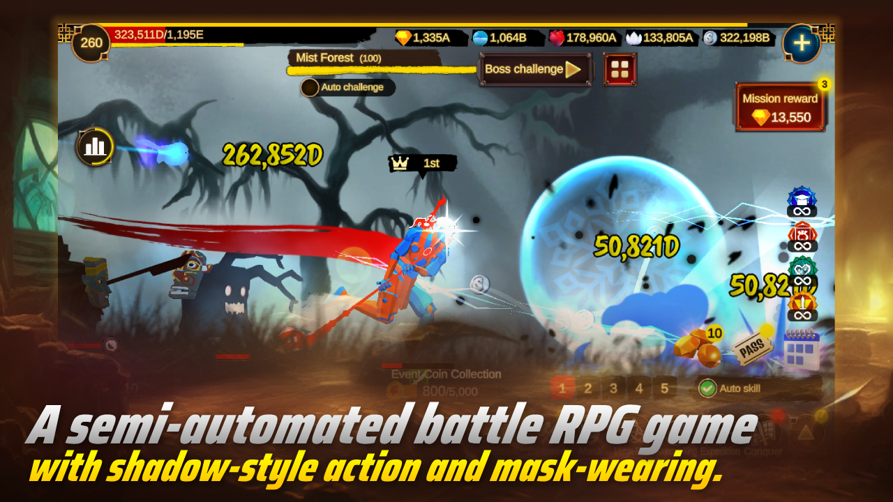 .A wide variety of adventure battles (Monster Hunt, Underworld Attack, Escape from Siege, Jungle Hell, Cold Hell, Heat Death Hell, Lord of Mask, Break Through Blood)