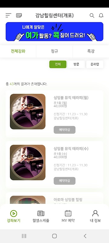 Gangnam Healing Center (COEX, Gaepo) program course registration, reservation, and payment services are provided simply and quickly.