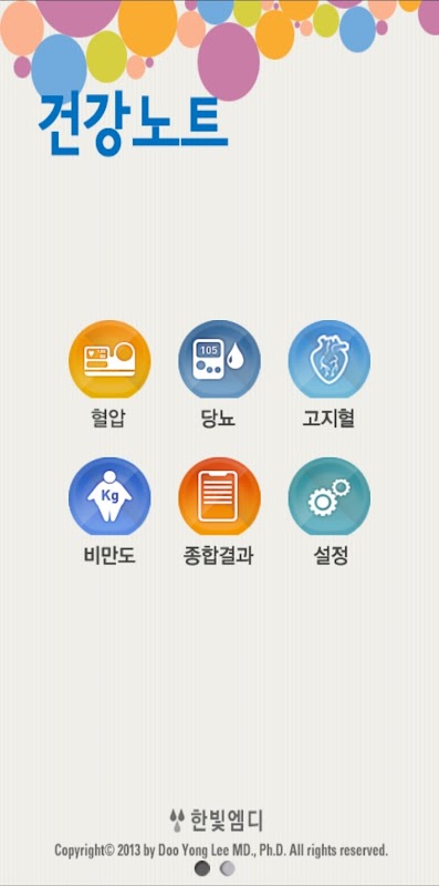 Health note app is a note-type application created by a clinician for personal health management. It includes various menus such as blood pressure management, blood sugar management, hyperlipidemia management, weight management, appointment management, other examination management, prescription storage, ladies notes, arteriosclerosis risk, obesity, and metabolic syndrome.