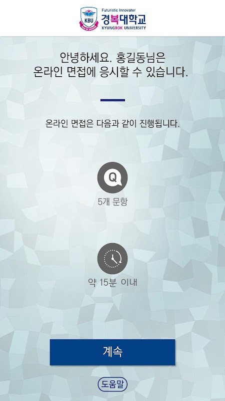 (입학원서에 기재된 이름과 수험번호를 동일하게 입력해야 "면접시작"이 가능합니다)