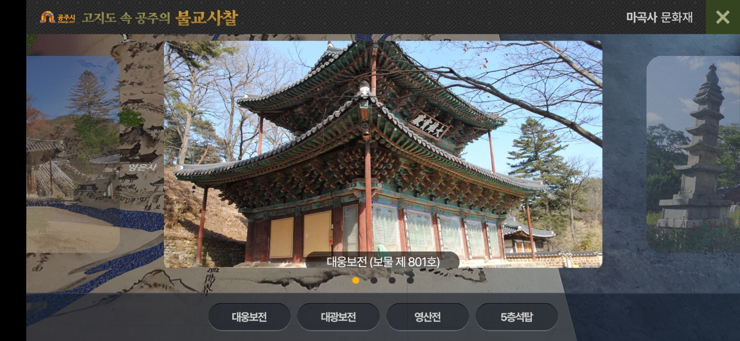 It is an augmented reality (AR) app that allows you to travel to Buddhist temples in Gongju in an old map (local map, Gongju Mokjido, 1872).