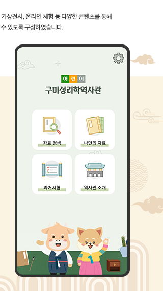 구미성리학역사관 App에서는 자동 전시 음성안내 서비스를 이용할 수 있으며, 스마트폰 카메라 촬영을 통해 쉽게 전시자료 검색이 가능합니다. 또한 VR 투어, 고해상도 이미지 등의 전시콘텐츠 서비스를 제공하며, 어린이 모드에서는 직접 전시자료를 수집하거나 게임 등의 서비스를 통해 역사관을 즐길 수 있습니다.