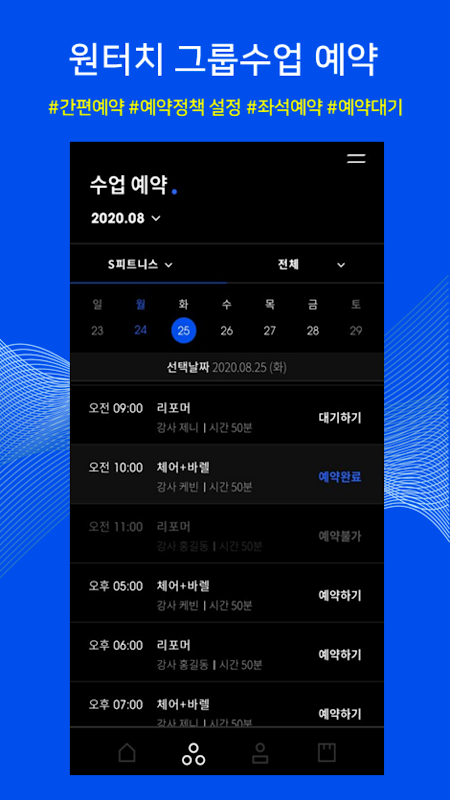 바디코디 가맹점을 이용하는 고객들은 별도로 수업시간을 선생님과 조율할 필요없이 스마트폰에서 언제든지 이용할 시간을 미리 예약할 수 있습니다.