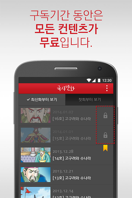 매주 업데이트되는 국사만화 자유이용권이 월 1000원입니다. 하루 33원이죠.