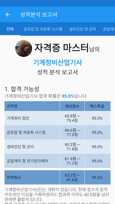 성적확인 - 각 과목별 성적 및 그동안 풀어본 기출문제와 모의고사, 문제풀기의 성적을 볼 수 있습니다.