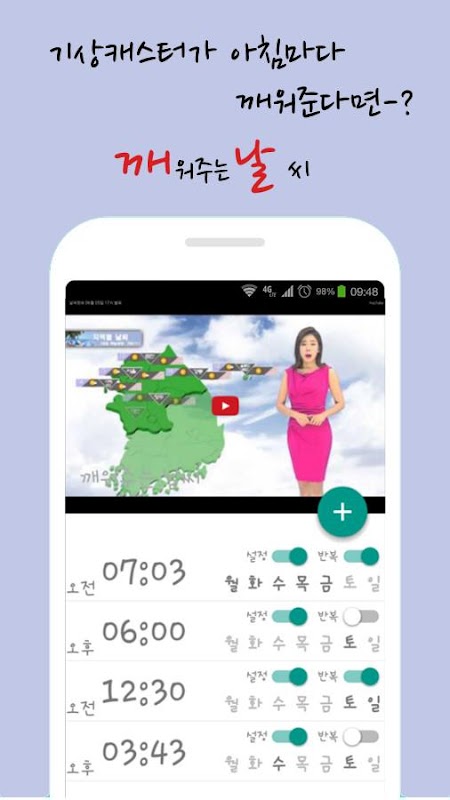 아침마다 기상 캐스터가 깨워준다면~?깨날로 알람을 쓰시면기상캐스터의 일기예보를 들으며 일어날 수 있습니다(기상청 날씨 동영상을 알람으로)