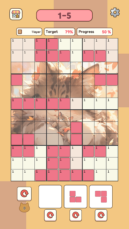 Use randomly provided blocks and place them on a 9X12 board. Earn % by making the obscured reward AI image clearer by filling in the grid-patterned 3x3 rectangular space, 1x12 vertical line, or 9x1 horizontal line. When you reach the target % for each stage, you will receive a reward AI image and it will be saved in the gallery.