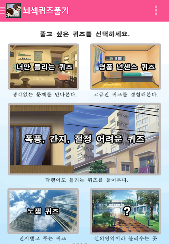 각 메뉴별 추리,논리,수리,넌센스 등이 구성되어 있어요