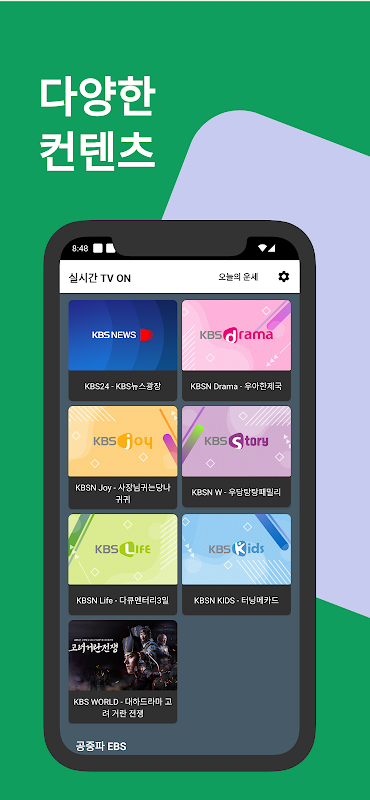 Watch a variety of live TV channels. MBC, KBS, SBS, EBS, JTBC, TV Chosun, Channel A, MBN