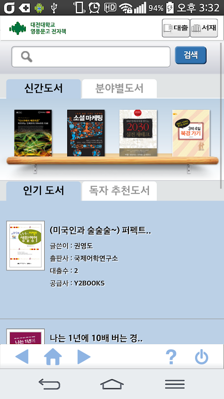 Daejeon University Youngpoong paperback books using services of e-books has been configured to allow easy use on your smartphone. Book by Book Search from the Start lending status, reservation, anytime, anywhere access via a smartphone without connecting to the charging function Youngpoong university library e-book application homepage that can be used, such as in a library