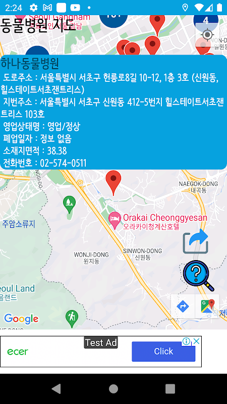 Displays the locations of veterinary hospitals nationwide, business status, and phone numbers.