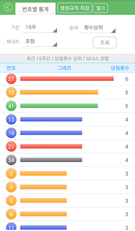 전체, 5주, 10주, 15주 등 다양한 기간, 보너스 포함여부 등 생성규칙을 지정하는 다양한 조건으로 조회할 수 있습니다.