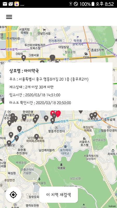 마스크 서치는 약국, 우체국, 농협등에 위치 기반으로 마스크 재고 파악 어플리케이션입니다.