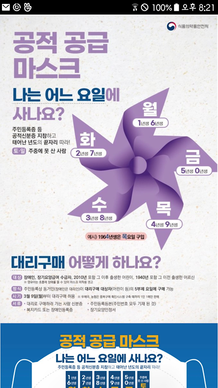 식품의약청안전처에서 발급한 공적 공급 마스크 구매 요일과 정책에 대한 정보를 제공합니다.