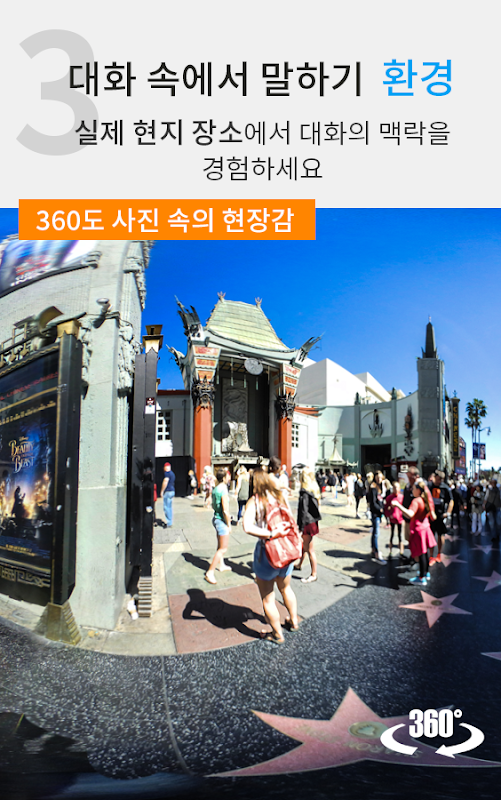 - 현지에서 직접 촬영한 360도 사진의 현장감 속에서, 영어 환경 그대로의 느낌으로 영어회화를 경험할 수 있는 앱 입니다.