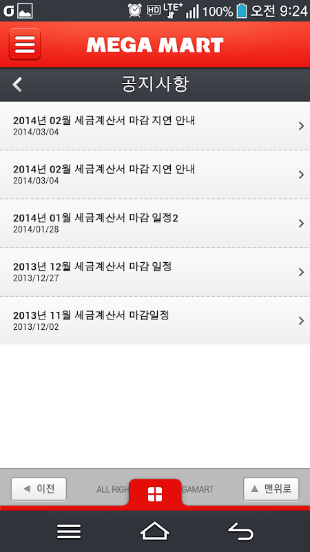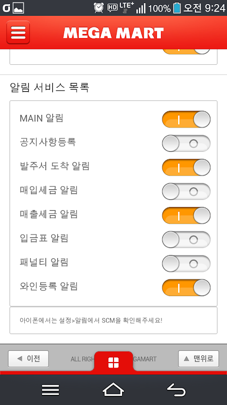 메가마트 앱 설치 시 알림서비스(공지사항, 발주, 세금계산서 등)의 기본 설정은 ON 상태입니다.