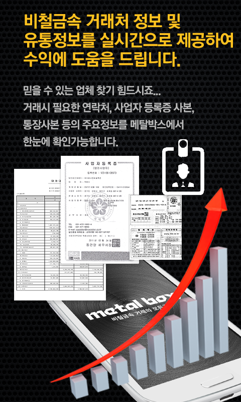 키워드: 메탈박스, metal box, 업체 관리, 비철금속, 거래 어플, 역경매 어플, LME, LME 시세, 실시간 시세, 스크랩상 거래, 공장 거래, 비철금속, 삽니다. 팝니다. 환율 시세, 상해 시세, 상해 LME, 동 시세, cu 시세, copper 시세, 조달청, 고시 가격, 오늘의 환율, 꽈배기, A동, 차핑, 챠핑, 캔디, 상동, 파동, 입찰, push 알람, push 메세지, push, 투자, 거래, 중계, 경매, 고철, 고물상, 스크랩상, 금속, 구리