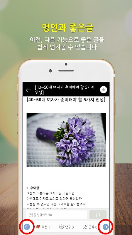 - 공유기능으로 명언, 사랑글귀, 좋은글, 마음가짐을 새롭게 해주는 글들을
